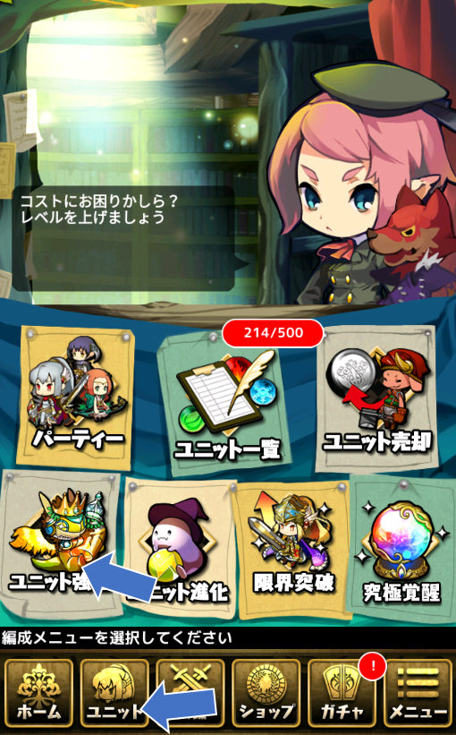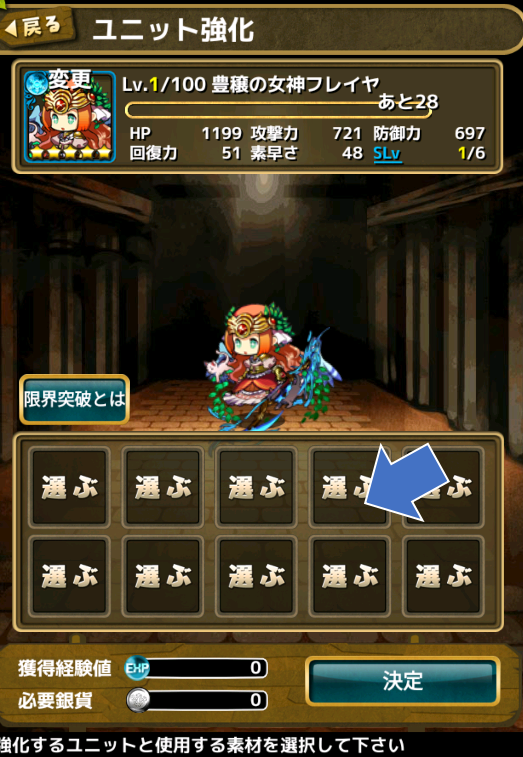 ユニットの強化には強化素材が必要よ。普通のユニットでも良いけど経験値はあまり入らないからオススメしないわ
