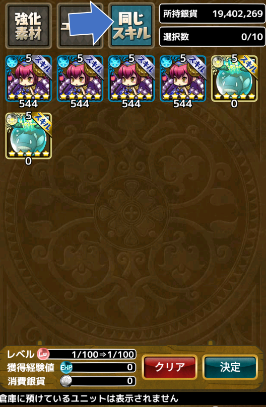 ユニットの強化画面で【同じスキル】を選択すると簡単に同名リーダスキルのユニットが表示されます。