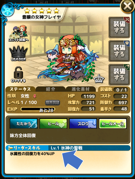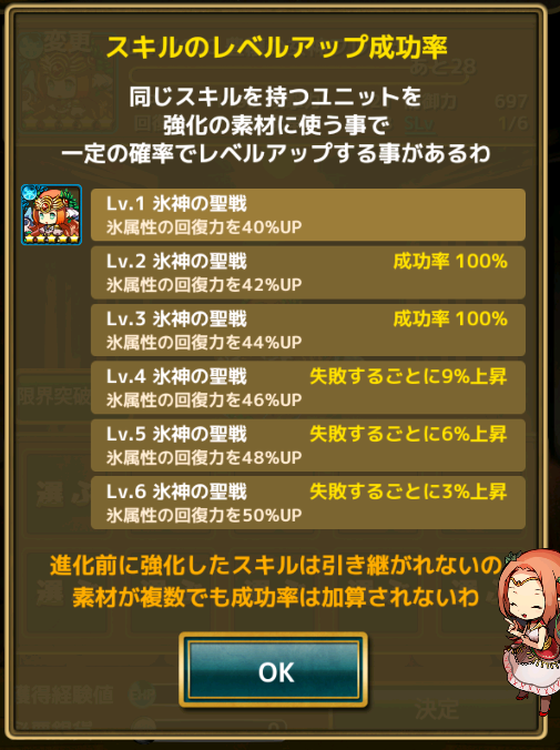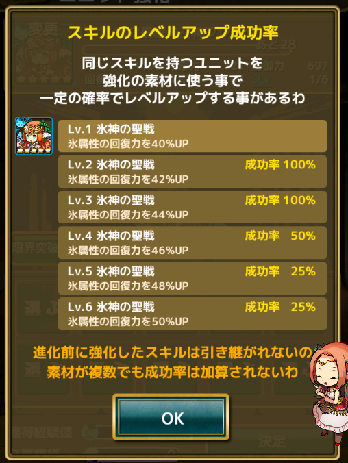 ほとんどのユニットにはパーティーのリーダにすることによって発動するスキルがあるわ。同じスキルのユニットを素材に強化すると一定の確立でスキルレベルが上昇するの