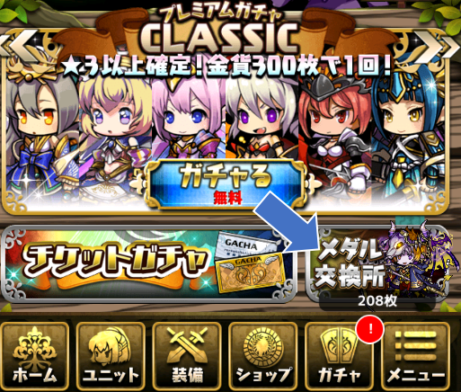 3メダル交換所で交換所は【メダル交換】でメダルと交換だ!メダルはプレミアムガチャなどを回すと貰えるよ!装備の素材も交換できるからオススメ!