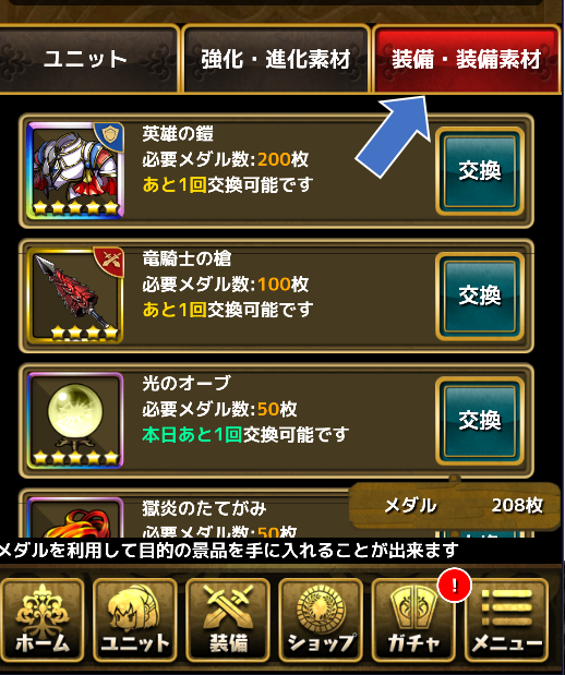 【ガチャ】→【メダル交換所】→【装備・装備素材】でメダルと交換できます。