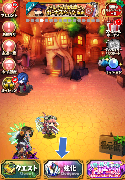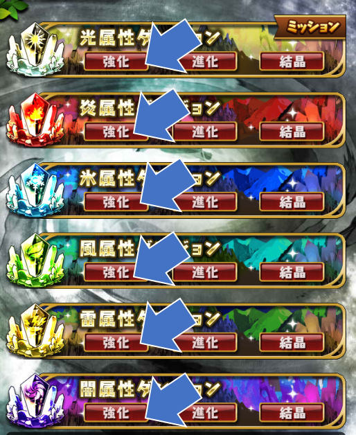 強化素材は【ホーム】→【強化】◯属性ダンジョンから入手可能です。