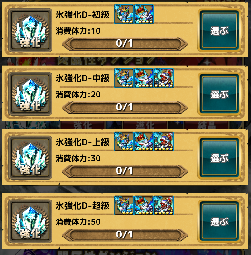 強化ダンジョンは【初級】【中級】【上級】【超級】とあるけど、すべて難易度はひくめよ。【超級】が一番オススメだけど消費体力が多いから注意してね友情ポイントに余裕があるなら強化フレンドガチャも良いわね