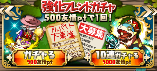 【ガチャ】→【強化フレンドガチャ】友情ポイント500で一回プレイできます。