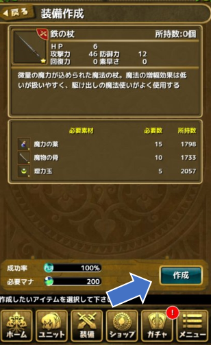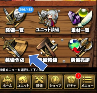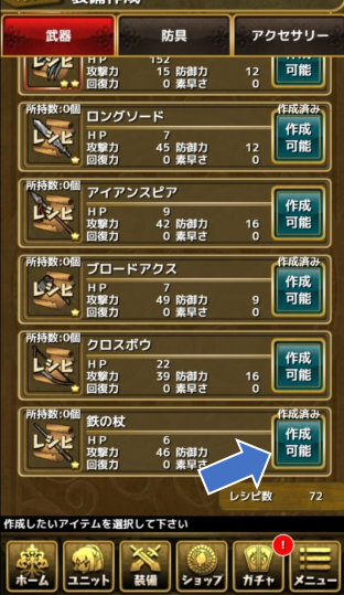 【装備】→【装備作成】→【作成したい装備をタップ】