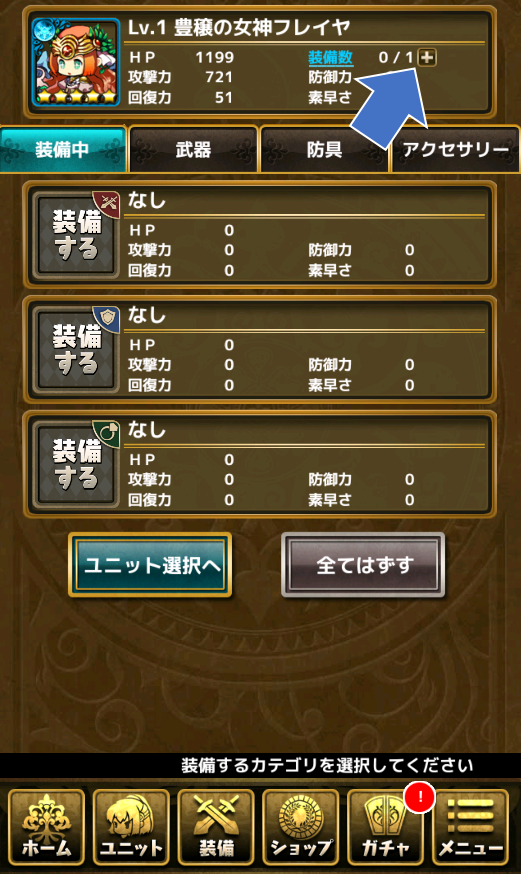 装備は【武器】【防具】【アクセサリー】の3種類あるよ!最初は1つしか装備出来ないけど装備枠を拡張することで3つまで装備できるよ!