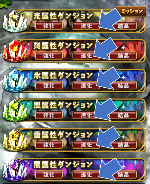強化と同じく【ホーム】→【進化】◯属性ダンジョンから入手可能です