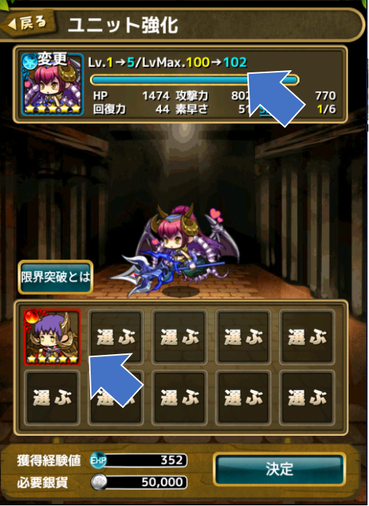 限界突破に必要な素材は☆5ユニットよ(強化素材除く)最大レベルが2上昇するわ。同じ名前の☆5ユニットなら最大レベルが5上昇するわ。