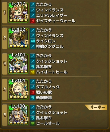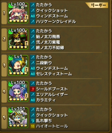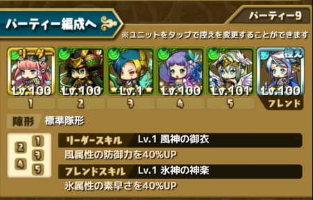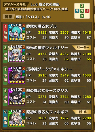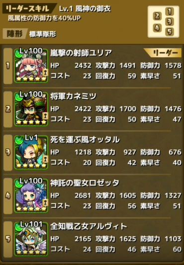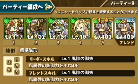 スキルでも【御衣】で編成し風属性耐久パーティーのお手本のような感じになりました( ´∀` )