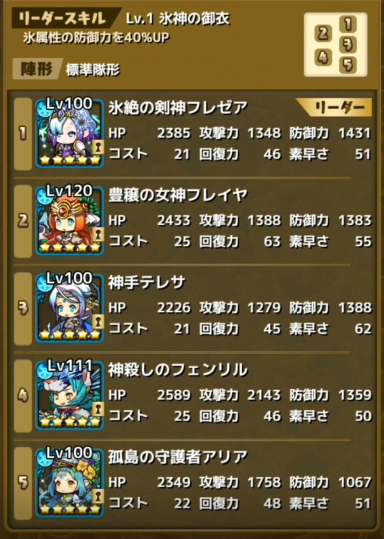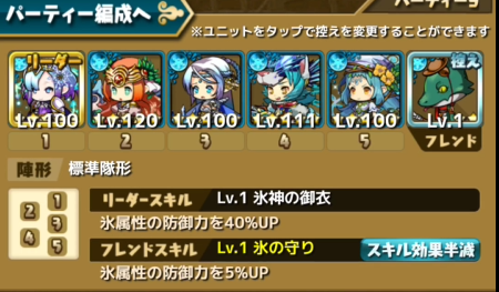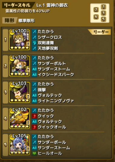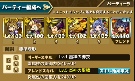 もし全体回復コマンドをもつユニットがいない場合無理に他の属性のヒーラーを入れるのではなくフレンドから借りるかフレンドスキルも【雷神の御衣】で統一させましょう!