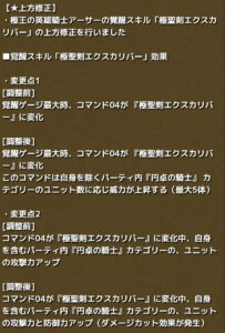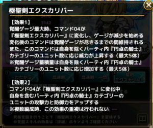 覚醒ゲージ最大時、コマンド04が『極聖剣エクスカリバー』に変化し、ゲージが減少を始める変化後のコマンドは覚醒ゲージが尽きるまでの間維持されるまた、このコマンドは自身を除くパーティ内『円卓の騎士』カテゴリーのユニット数に応じ威力が上昇する(最大5体)