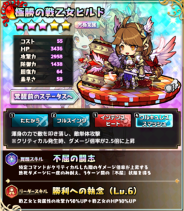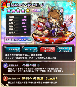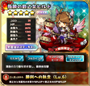 通常のリーダースキルは炎属性及び戦乙女の攻撃力をアップ 更に戦乙女であればHPを上昇させる戦闘特化型のスキルです。
