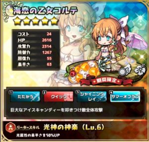 水着コルテをリーダーにしてその他 光属性の水着ユニットで編成させると楽しそうです。
