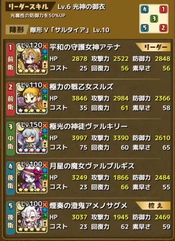 ①リーダースキルは素早さ上昇の【神楽】系、所持していなければ攻撃力上昇の【御剣】系