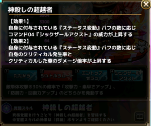 自身に付与されている『ステータス変動』バフの数に応じ自身のクリティカル発生率とクリティカルした際のダメージ倍率が上昇する