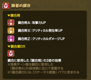 ※『調合薬DX』の効果や効果量は『験者の調合・極』使用時に消費された『調合剤』の種類と数に依存する