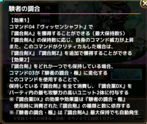 『調合剤A』の保持数に応じ、自身のコマンド威力が上昇また、このコマンドがクリティカルした場合は、『調合剤×』『調合剤z』を追加で獲得することができる