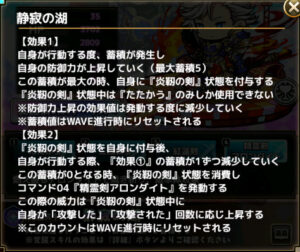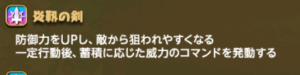 自身が行動する度、蓄積が発生し自身の防御力が上昇していく(最大蓄積5)この蓄積が最大の時、自身に『炎靭の剣』状態を付与する『炎靭の剣』状態中は『たたかう』のみしか使用できない