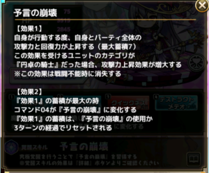 『効果1』の蓄積が最大の時コマンド04が『予言の崩壊』に変化する『効果1』の蓄積は、『予言の崩壊』の使用か3ターンの経過でリセットされる