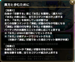 自身が「攻撃する」度に『氷刃』を獲得し(最大10)『氷刃』の数に応じ、全てのコマンド威力が上昇するまた、 『氷刃』を保持している状態では全ての攻撃コマンドで『凍結』状態の付与が可能となる『凍結』状態の付与率は『氷刃』の蓄積数とパーティ内の氷属性ユニットの数に応じて上昇する