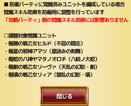 上記の覚醒ユニットは覚醒スキルに弱体化補正が入っています。自身のパーティ覚醒ユニットには影響がありません。