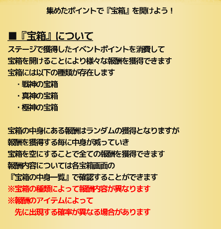 期限付きのイベントかつ、ポイントで開けられる宝箱の中身はランダムです。