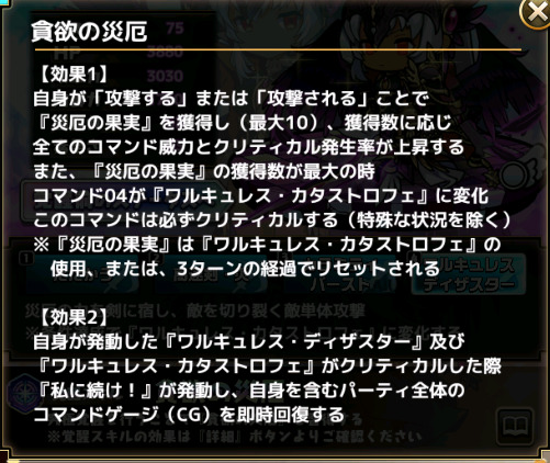 自身が「攻撃する」または「攻撃される」ことで『災厄の果実』を獲得し(最大10)、獲得数に応じ全てのコマンド威力とクリティカル発生率が上昇するまた、 『災厄の果実』の獲得数が最大の時コマンド04が『ワルキュレス・カタストロフェ』に変化このコマンドは必ずクリティカルする(特殊な状況を除く)※『災厄の果実』は『ワルキュレス・カタストロフェ』の使用、または、3ターンの経過でリセットされる