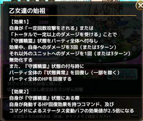 自身が「一定回数攻撃をされる」または「トータルで一定以上のダメージを受ける」ことで『守護精霊』状態をパーティ全体へ付与し効果中、自身へのダメージを3回(または3ターン)それ以外のユニットへのダメージを1回(または3ターン)無効化するまた、 『守護精霊』状態の付与時にパーティ全体の『状態異常』を回復し(一部を除く)パーティ全体のHPを回復する
