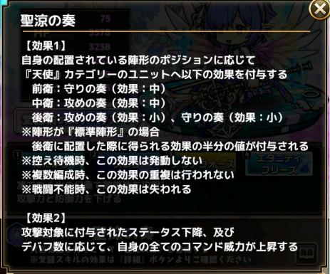 自身の配置されている陣形のポジションに応じて『天使』カテゴリーのユニットへ以下の効果を付与する