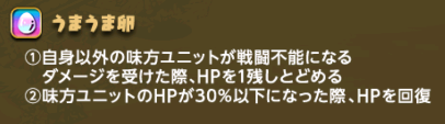 うまうま卵:①自身以外の味方ユニットが戦闘になるダメージを受けた際、HP1を残しとどまる。