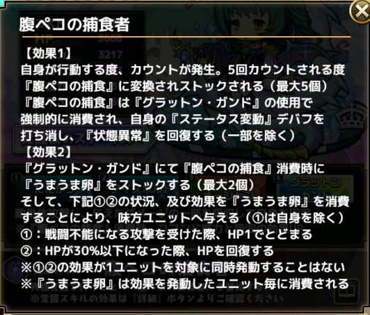 『グラットン・ガンド』にて『腹ペコの捕食』消費時に『うまうま卵』をストックする(最大2個)そして、下記①②の状況、及び効果を『うまうま卵』を消費することにより、「 味方ユニットへ与える(①は自身を除く)