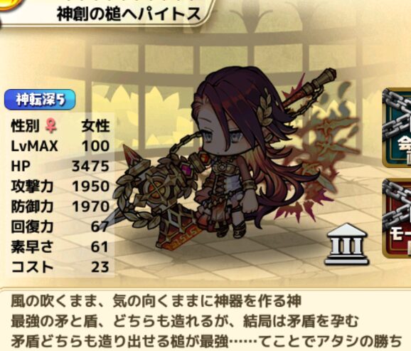 強力なデバフと火力がウリのオオタケマルと補助が得意なヘパイトスでは比べることはできませんが、属性が限定されるステージとかもあるので、できれば炎と風属性は避けてほしかったですね(´ω`)