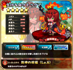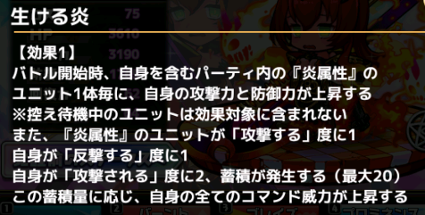 ・パーティの炎属性ユニット毎に自身の攻撃と防御力を上昇