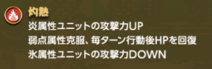 灼熱:炎属性の攻撃力UP弱点属性克服、毎ターン行動後HPを回復、氷属性ユニットの攻撃力DOWN