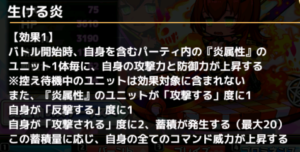 ※控え待機中のユニットは効果対象に含まれない、また 『炎属性』のユニットが「攻撃する」度に1自身が「反撃する」度に1自身が「攻撃される」度に2、蓄積が発生する(最大20)この蓄積量に応じ、自身の全てのコマンド威力が上昇する