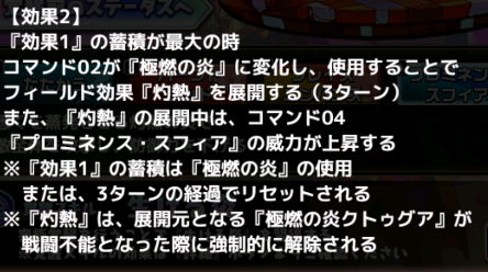 『効果1』の蓄積が最大の時コマンド02が『極燃の炎』に変化し、使用することでフィールド効果『灼熱』を展開する(3ターン)また、 『灼熱』の展開中は、コマンド04『プロミネンス・スフィア』の威力が上昇する