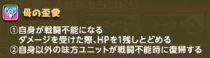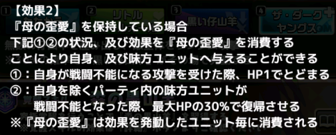 『母の歪愛』を保持している場下記①②の状況、及び効果を『母の歪愛』を消費することにより自身、 及び味方ユニットへ与えることができる