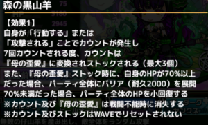 自身が「行動する」または「攻撃される」ことでカウントが発生し7回カウントされる度、 カウントは『母の歪愛』に変換されストックされる(最大3個)また、 『母の歪愛』ストック時に、自身のHPが70%以上だった場合、パーティ全体にバリア(耐久2000)を展開70%未満だった場合、パーティ全体のHPを小回復する