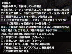 『輪転の残滓』を保持している場合自身を含むパーティ内の味方ユニットが戦闘不能となった際これを全て消費し、下記①②の効果をパーティ全体へ与える