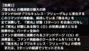 『陰る光』の獲得数が最大の時コマンド04が『ワルキュレス・フリューゲル』に変化するこのコマンドの発動後、保持している『陰る光』を全て消費して、『冥光』状態(3ターン)を自身に付与し