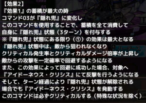 ※『隠れ兜』状態にある限り(①)の効果は最大となる『隠れ兜』状態中は、敵から狙われなくなりクリティカル発生率とクリティカルダメージ倍率が上昇し敵からの攻撃を一定確率で回避するようになるまた、この効果によって回避に成功した場合、対象へ『アイドーネウス・クリシス』にて反撃を行うようになるそして、ターン経過により『隠れ兜』状態が解除される場合でも『アイドーネウス・クリシス』を発動するこのコマンドは必ずクリティカルする(特殊な状況を除く)
