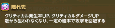 隠れ兜:クリティカル発生率UP、クリティカルダメージUP敵から狙われなくなり、一定の確率で攻撃を回避する。