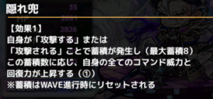 『効果1』の蓄積が最大の時コマンド03が『隠れ兜』に変化しこのコマンドを使用することで、蓄積を全て消費して自身に『隠れ兜』状態(3ターン)を付与する
