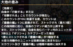 また、ストックの際、自身を含むパーティ内のユニットが3体以上『ギリシャ』カテゴリーだった場合1度にストックされる『豊穣の種』が1増加する