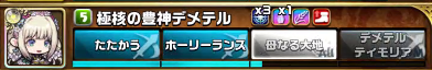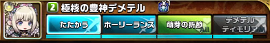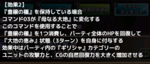 『豊穣の種』を保持している場合コマンド03が『母なる大地』に変化するこのコマンドを使用することで『豊穣の種』を1つ消費し、パーティ全体のHPを回復して『大地の恵み』状態(3ターン)を自身に付与する効果中はパーティ内の『ギリシャ』カテゴリーのユニットの攻撃力と、CGの自然回復力を大きく増加させる