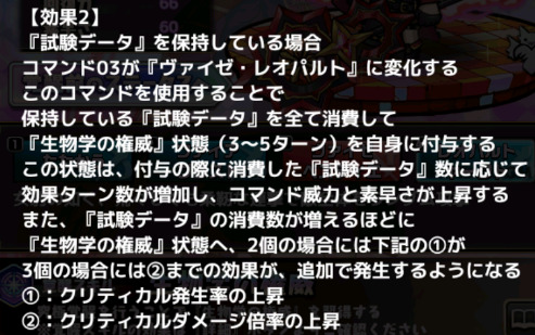 『試験データ』を保持している場合コマンド03が『ヴァイゼ・レオパルト』に変化するこのコマンドを使用することで保持している『試験データ』を全て消費して『生物学の権威』状態(3〜5ターン)を自身に付与するこの状態は、付与の際に消費した『試験データ』数に応じて効果ターン数が増加し、 コマンド威力と素早さが上昇する