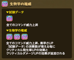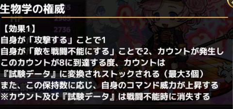 また、 『試験データ』の消費数が増えるほどに『生物学の権威』状態へ、2個の場合には下記の①が3個の場合には②までの効果が、追加で発生するようになる