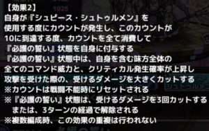 自身が『シュピース・シュトゥルメン』を使用する度にカウントが発生し、このカウントが10に到達する度、カウントを全て消費して必護の誓い』状態を自身に付与する。