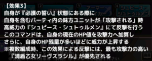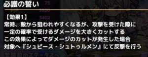 常時、敵から狙われやすくなるが、攻撃を受けた際に一定の確率で受けるダメージを大きくカットするこの効果によってダメージのカットが発生した場合対象へ『シュピース·シュトゥルメン』にて反撃を行う。